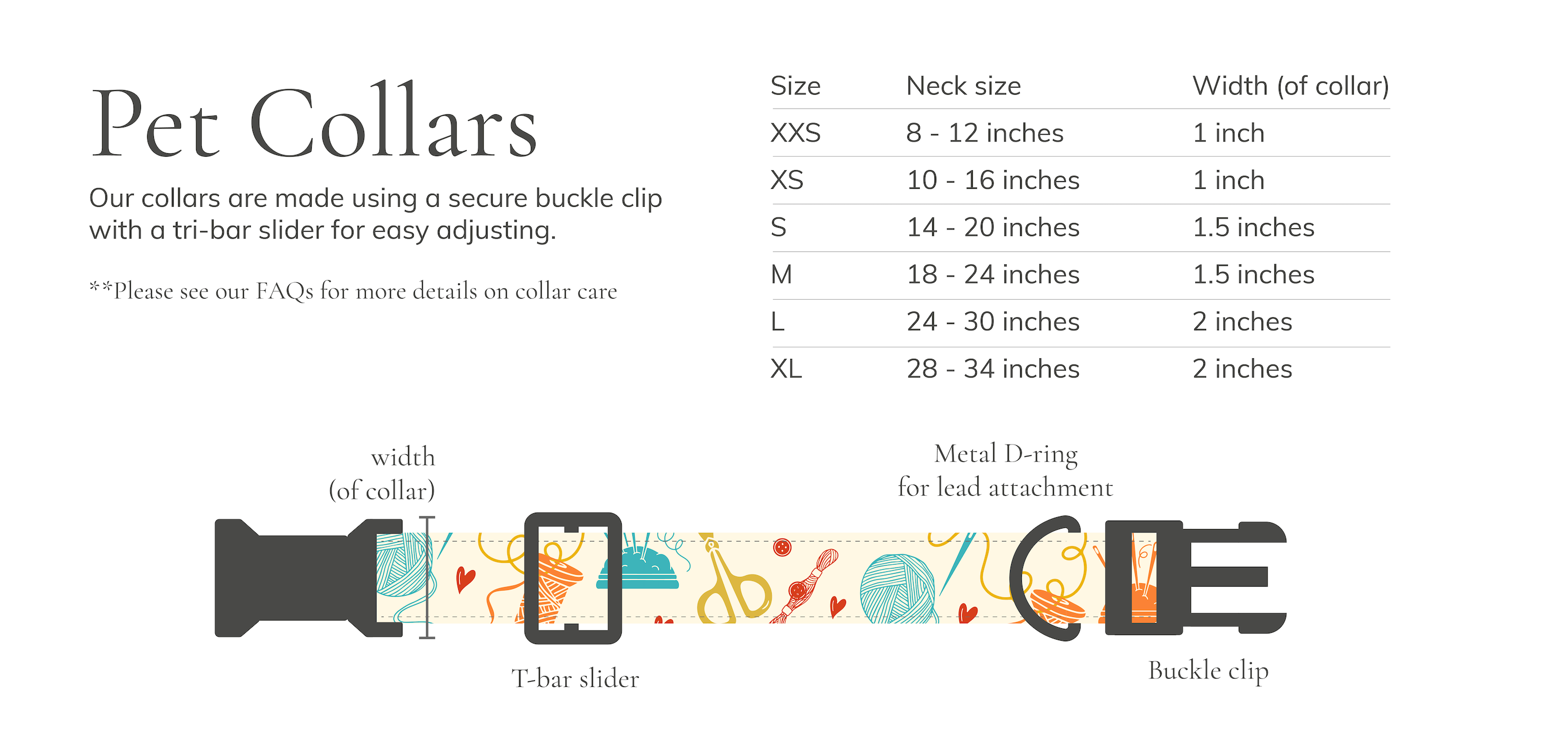 We have a size guide avaliable (please see below) for all our pet accessories. This is avaliable on our product listings but we are more than happy to help/advise. Please contact us at homemadecraftsbykate@gmail.com and we will do our very best for help you find the best size for your pet.