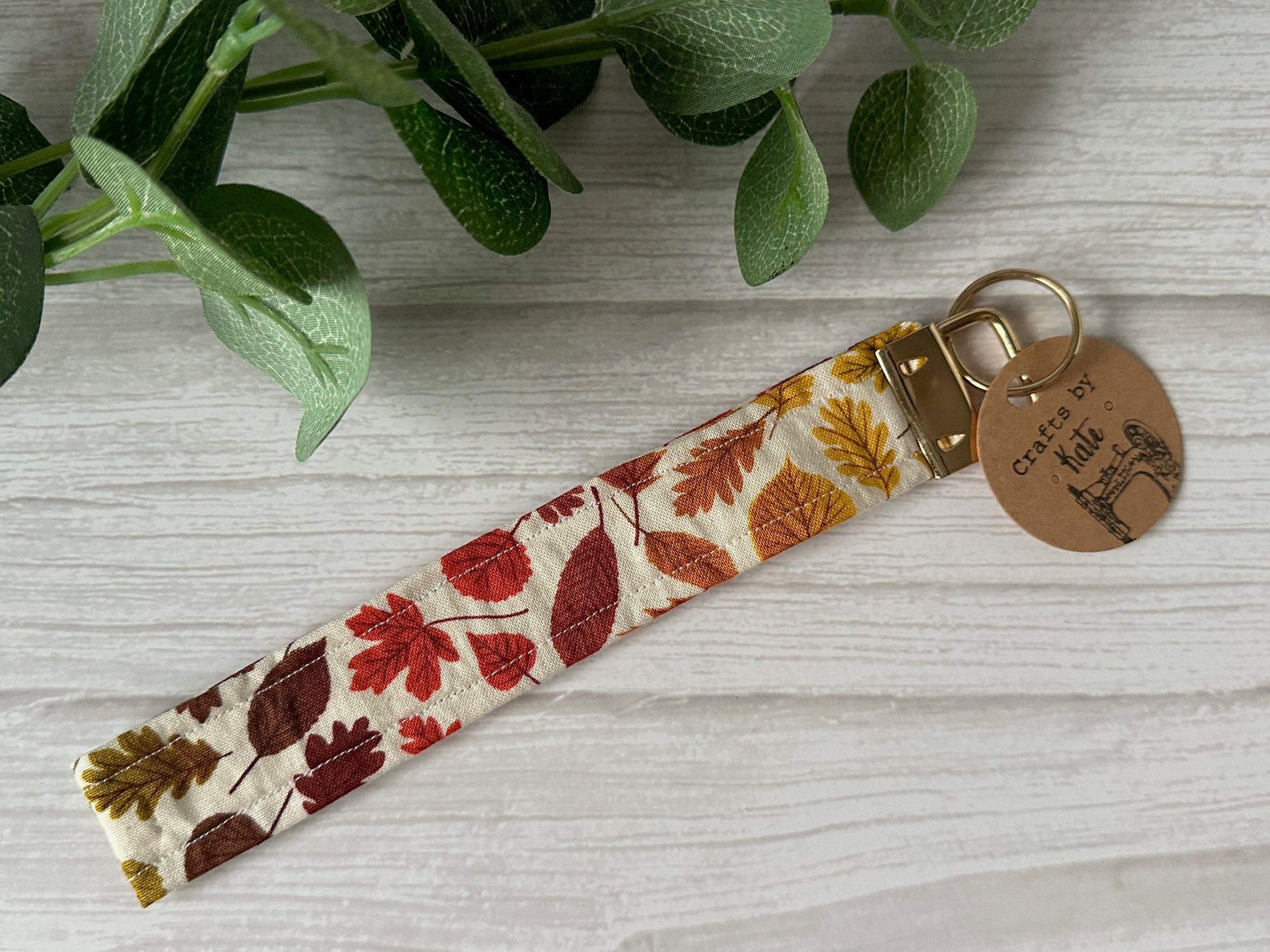 Handcrafted luxury Autumn Leaves cotton Wristlet with a metal fob keychain.