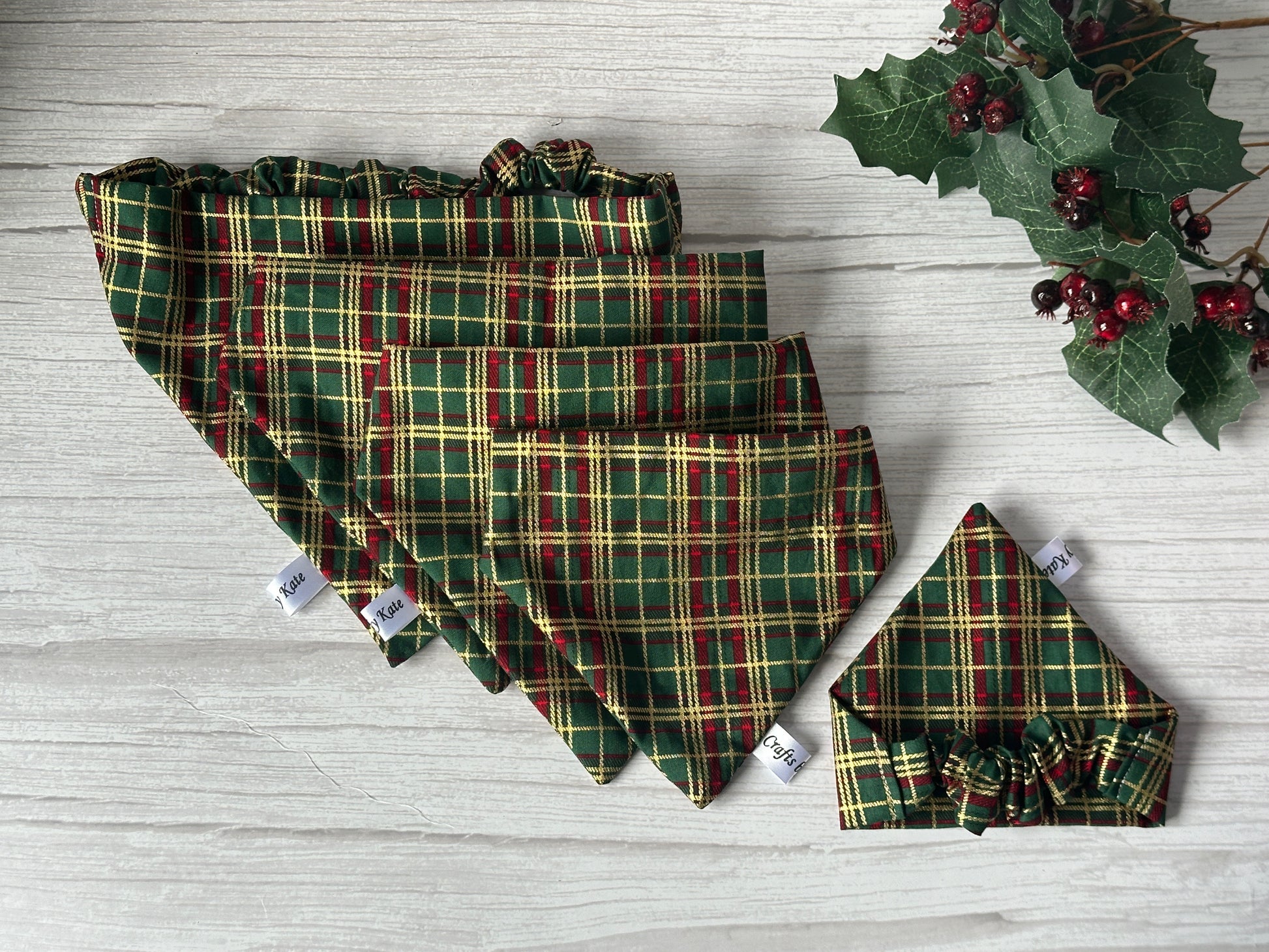 Cotton Pet Scrunchie Bandana - Green & Gold Tartan