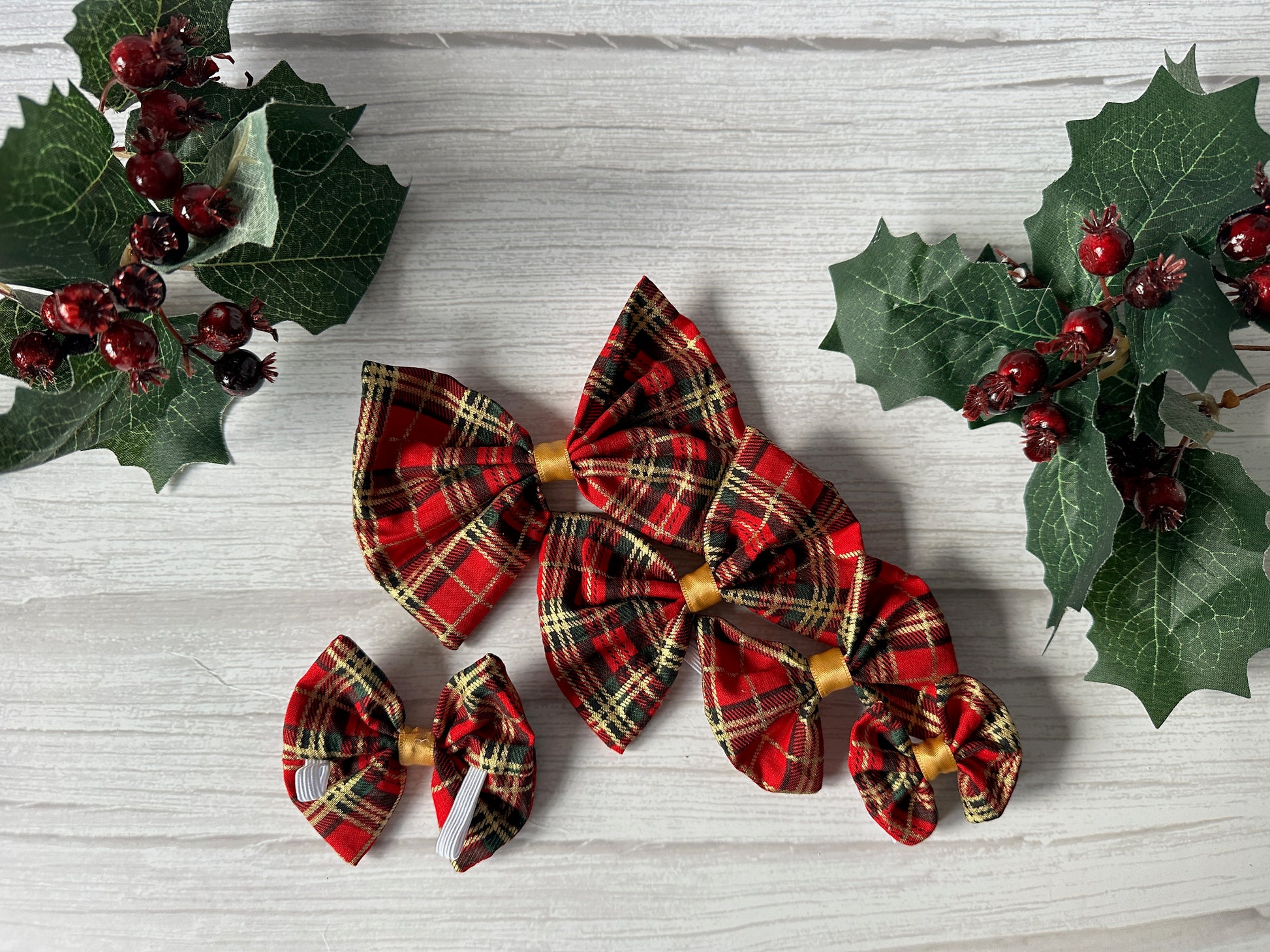 Cotton Pet Bow with collar attachment - Red & Gold Tartan