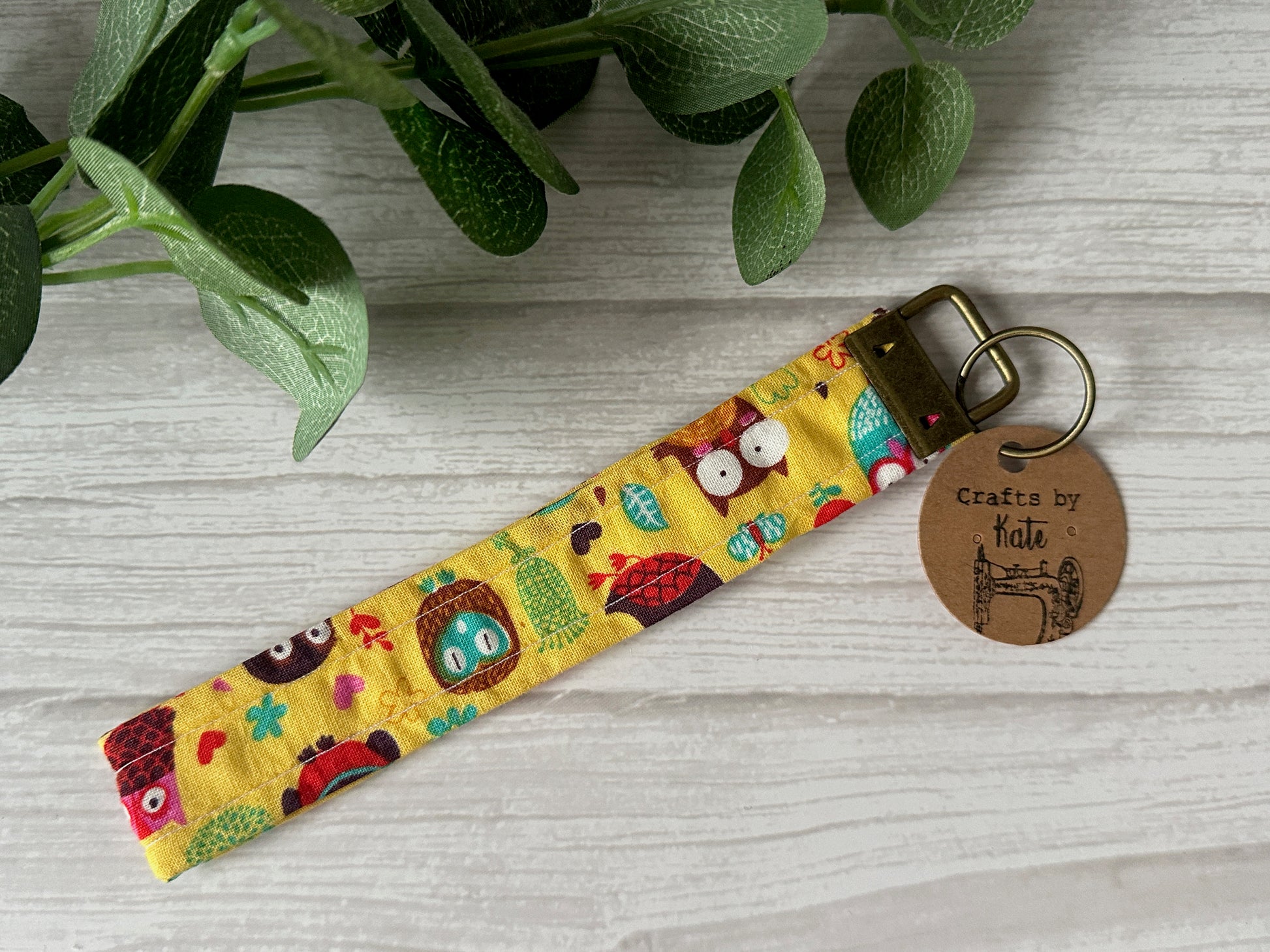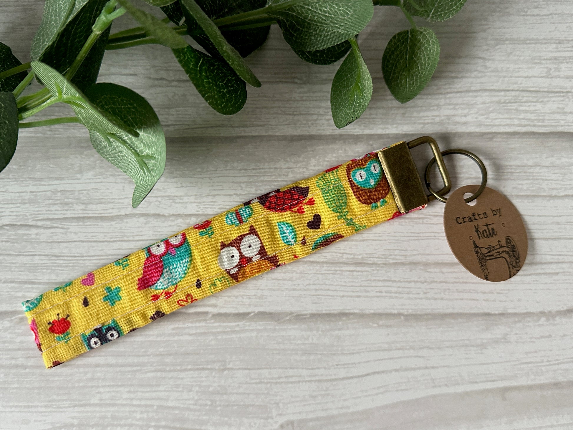 Handcrafted luxury Yellow Owl Print cotton Wristlet with a metal fob keychain.